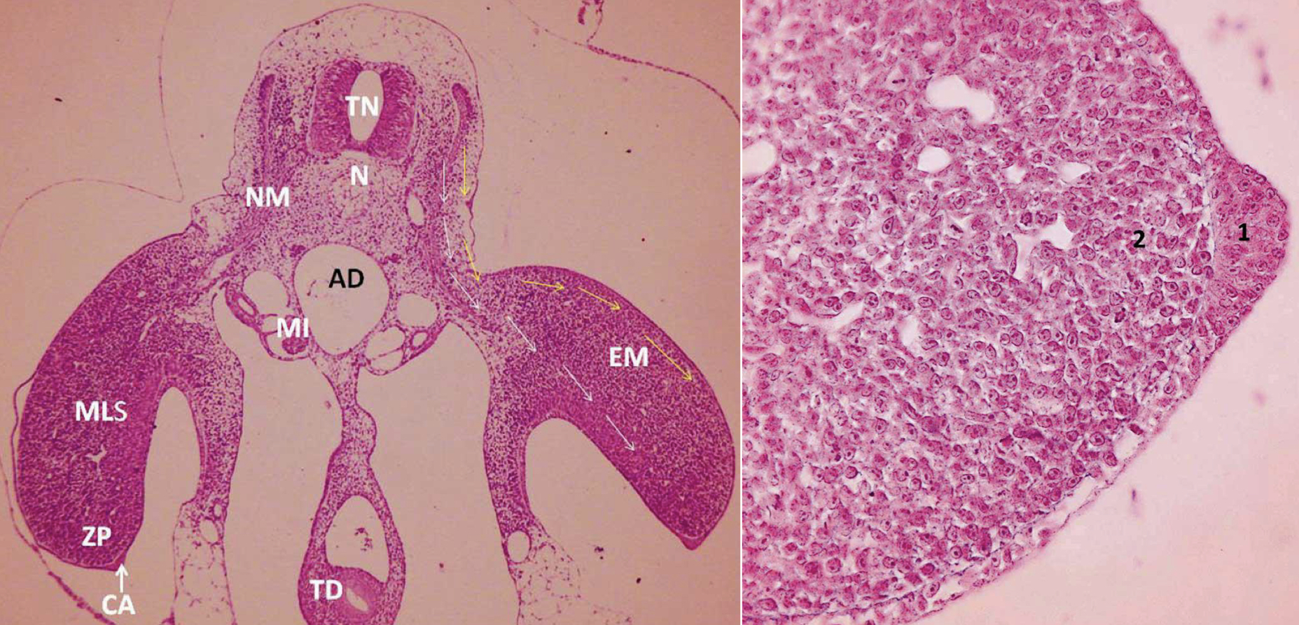 Células del hipómero de los somitas adyacentes a los esbozos de miembros migran en grupos pequeños, una población de células da origen a masas premusculares dorsales (extensoras) y ventrales (flexoras).