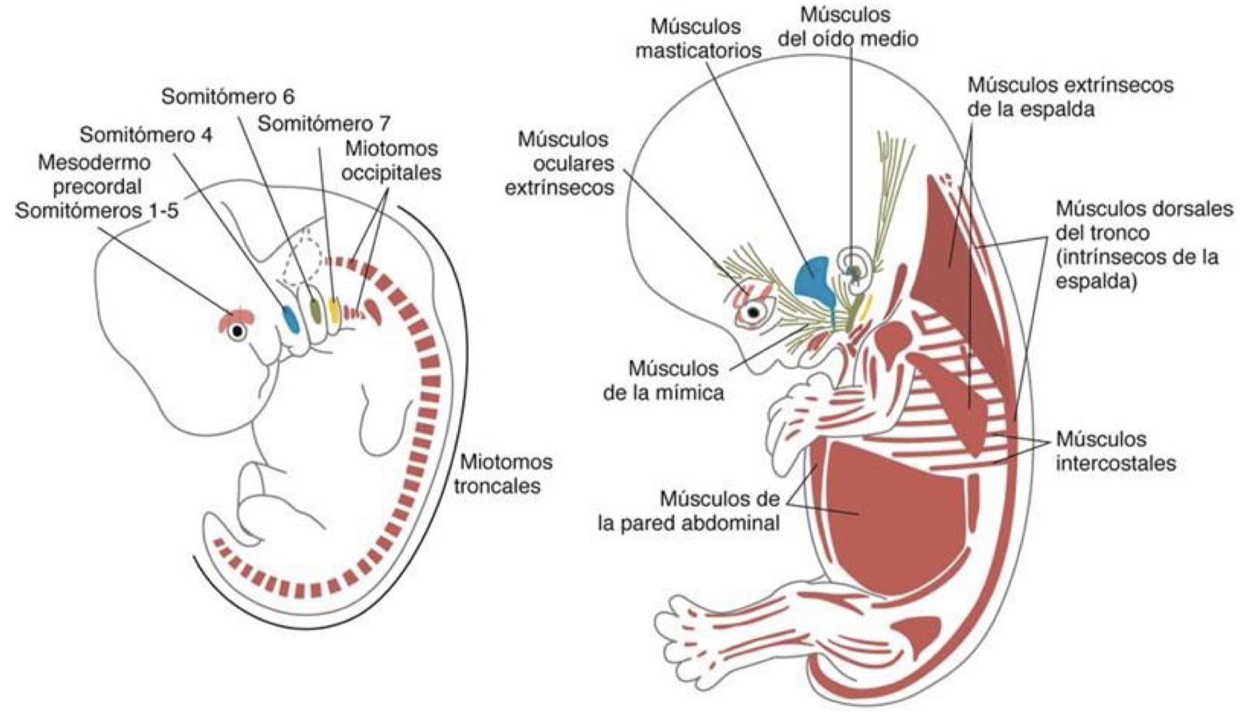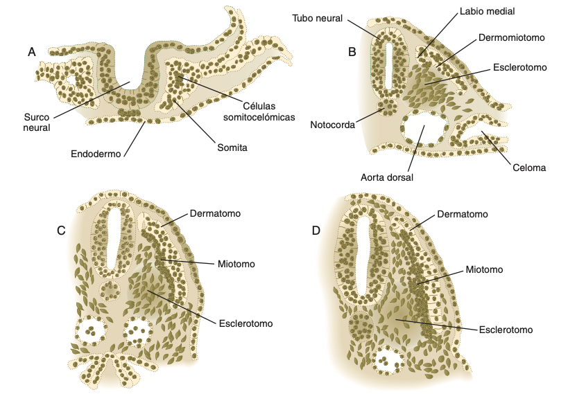 El desarrollo de huesos y músculos comienza en la cuarta semana de gestación, cuando el mesodermo paraxial se diferencia en somitas; este último da lugar al esclerotomo, miotomo, y miotomo. El esclerotomo rodea a la notocorda y tubo neural, dando origen a las vértebras y las costillas, mientras que los miotomas forman la mayor parte del sistema muscular. El dermatomo da origen a la dermis.