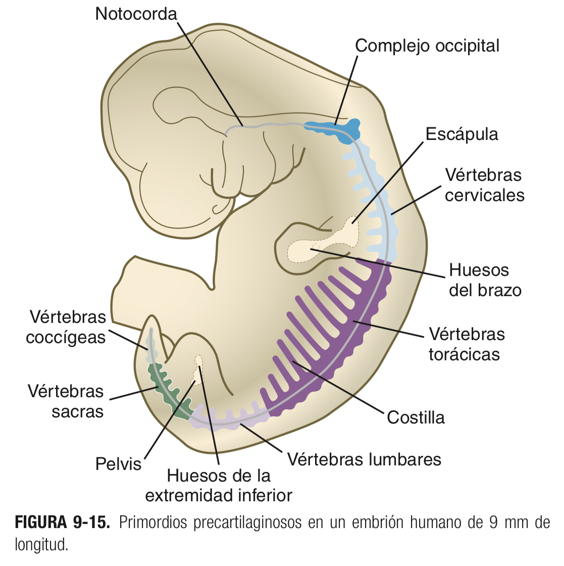 Los elementos esqueléticos profundos del organismo aparecen de forma característica al principio como modelos cartilaginosos sobre los que finalmente surgirán los huesos. En períodos concretos de la embriogénesis, el cartílago es reemplazado por hueso auténtico a través del proceso de osificación endocondral. En cambio, los huesos superficiales de la cara y del cráneo se forman por la osificación directa de las células mesenquimatosas, sin pasar por el estadio intermedio cartilaginoso (osificación intramembranosa).