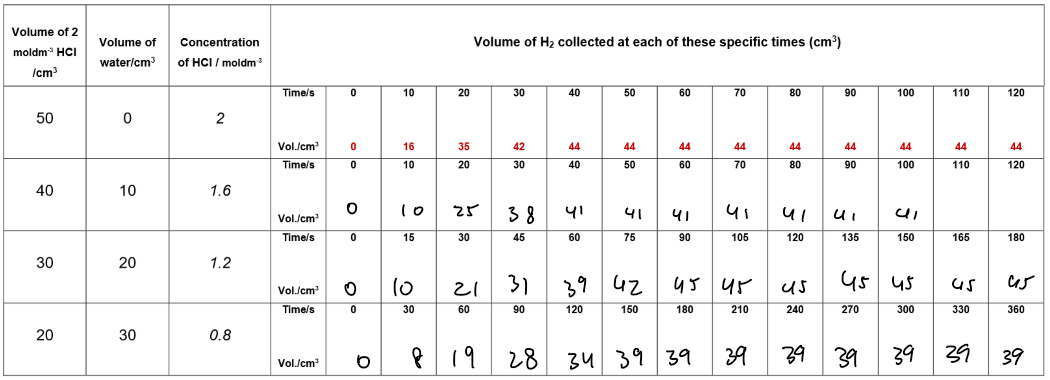Volume of 2 mol dm⁻³ HCl / cm³ | Volume of Water / cm³ | Concentration / mol dm⁻³ | Time / s |