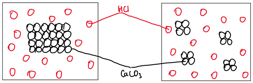 Less particles of CaCo3 with HCL as the reaction proceeds