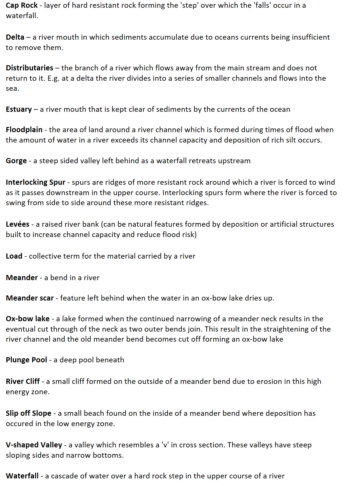 River Cliff - a small cliff formed on the outside of a meander bend due to erosion in this high energy zone.