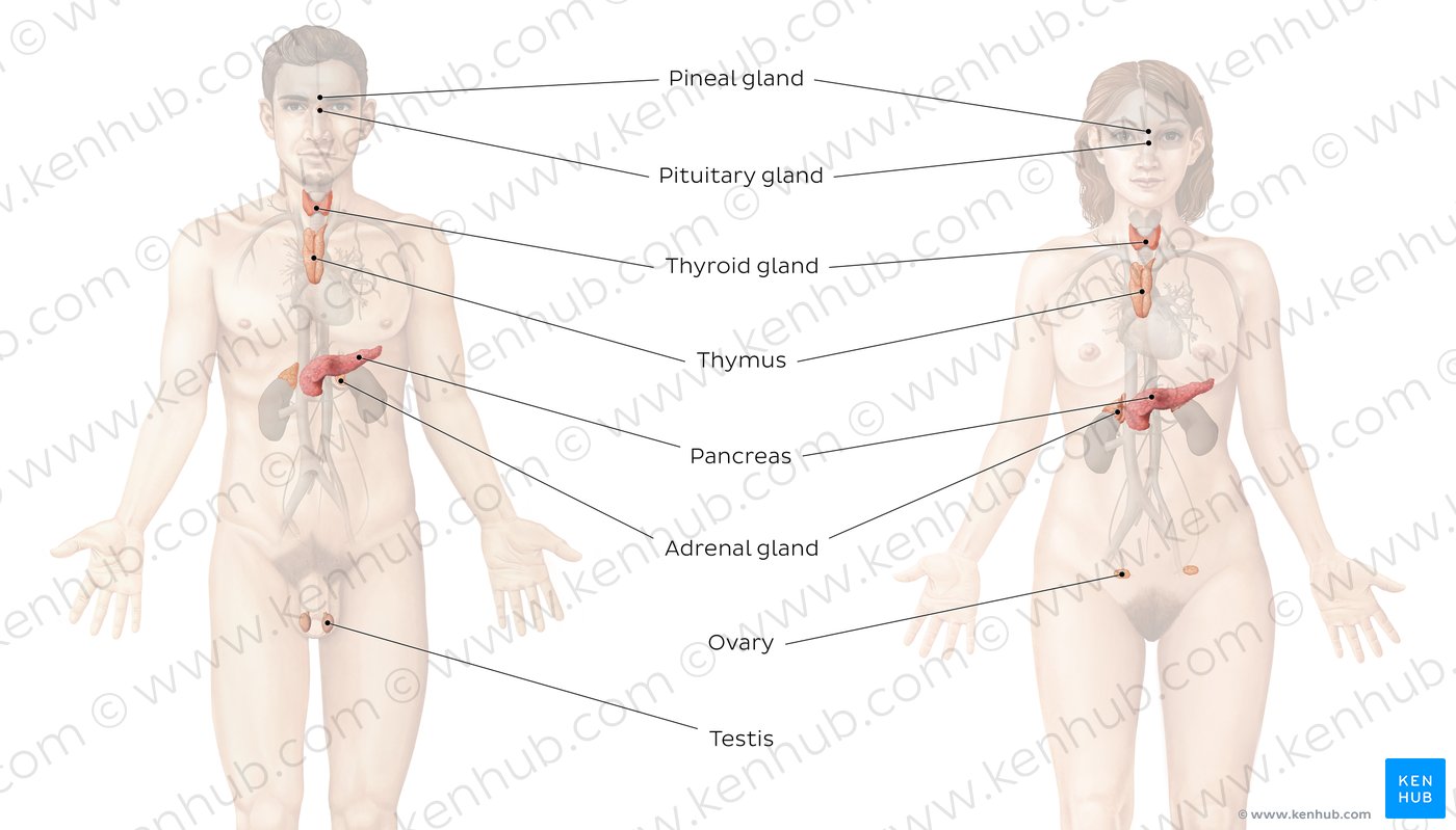 The endocrine system is a collection of specialised organs (endocrine glands) scattered throughout the body that act to produce hormones. The main organs of the endocrine system can be seen in the diagram below.