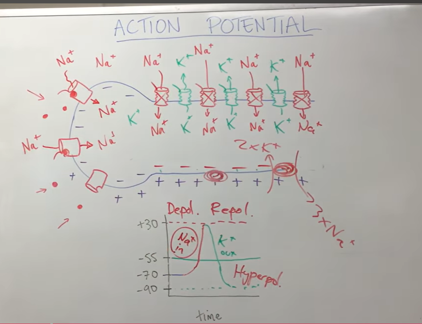 An action potential happens when the positively charged sodium ions enter the neuron and create a charge that goes above -55mV.
