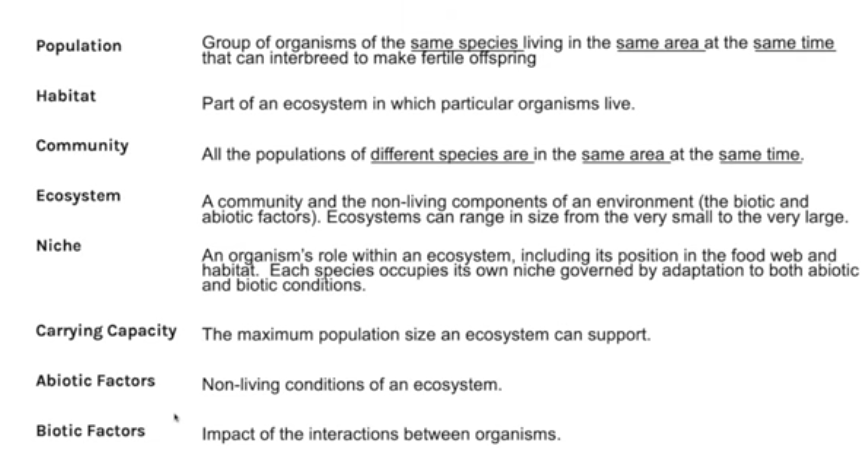 population = all the individuals of one species in one area at one time that can interbreed to make fertile offspring
