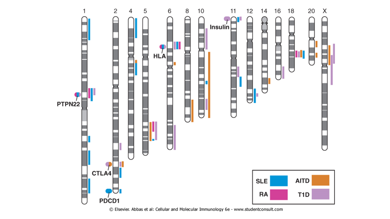 Susceptibility loci for autoimmune diseases. The chromosomal loci associated with some autoimmune diseases are shown. The location of candidate genes of immunologic interest are indicated as ovals on the left of the chromosomes. These ovals are color coded to indicate the diseases to which the genes are linked. SLE, systemic lupus erythematosus; AITD, autoimmune thyroid disease; RA, rheumatoid arthritis; T1D, type 1 diabetes