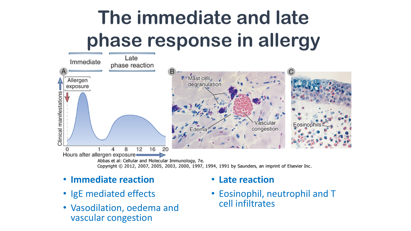 Figure 19-7 The immediate and late-phase reactions of allergy. A, Kinetics. The immediate vascular and smooth muscle reaction to allergen develops within minutes after challenge (allergen exposure in a previously sensitized individual), and the late-phase reaction develops 2 to 24 hours later. B, C, Morphology. The immediate reaction (B) is characterized by vasodilation, congestion, and edema, and the late-phase reaction (C) is characterized by an inflammatory infiltrate rich in eosinophils, neutrophils, and T cells. (Courtesy of Dr. Daniel Friend, Department of Pathology, Brigham and Women's Hospital, Boston, Massachusetts.)