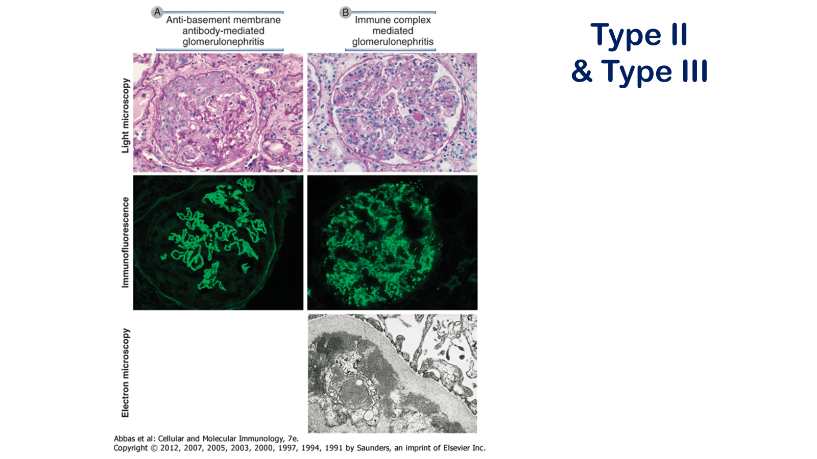 Pathologic features of antibody-mediated glomerulonephritis. A, Glomerulonephritis induced by an antibody against the glomerular basement membrane (Goodpasture's syndrome): the light micrograph shows glomerular inflammation and severe damage, and immunofluorescence shows smooth (linear) deposits of antibody along the basement membrane. B, Glomerulonephritis induced by the deposition of immune complexes (systemic lupus erythematosus): the light micrograph shows neutrophilic inflammation, and the immunofluorescence and electron micrograph show coarse (granular) deposits of antigen-antibody complexes along the basement membrane.