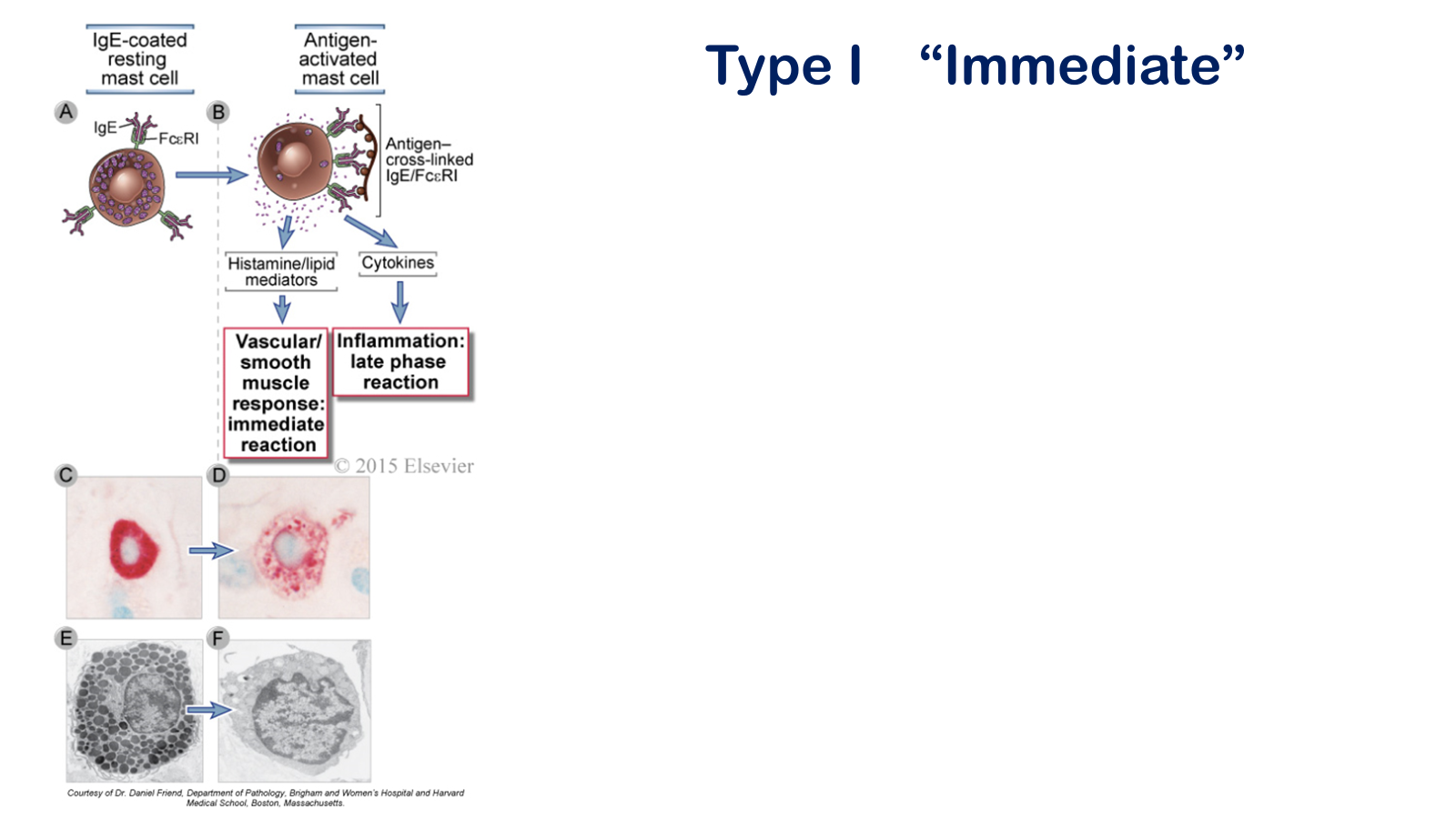 Mast cell activation. Antigen binding to IgE cross-links FcΕRI molecules on mast cells, which induces the release of mediators that cause the hypersensitivity reaction (A, B). Other stimuli, including the complement fragment C5a, can also activate mast cells. A light photomicrograph of a resting mast cell with abundant purple-staining cytoplasmic granules is shown in C. These granules are also seen in the electron micrograph of a resting mast cell shown in E. In contrast, the depleted granules of an activated mast cell are shown in the light photomicrograph (D) and electron micrograph (F).