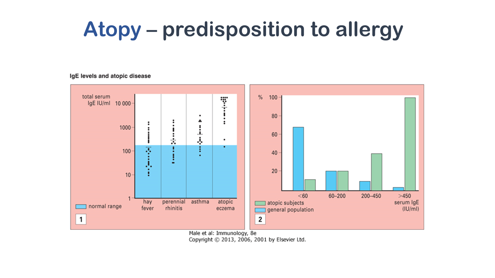 (1) The serum concentration of IgE (which is around 100 IU/mL) is only approximately 0.001% that of IgG (around 10 mg/mL) and comprises less than 0.001% of the total immunoglobulin. Levels in atopic patients tend to be raised, and this is especially so in atopic eczema (the International Unit [IU] for IgE equals 2.4 ng). (2) The higher the level of IgE, the smaller the percentage of the population is affected, but the greater the likelihood of atopy. Where the level is greater than 450 IU/mL the majority of subjects are atopic.