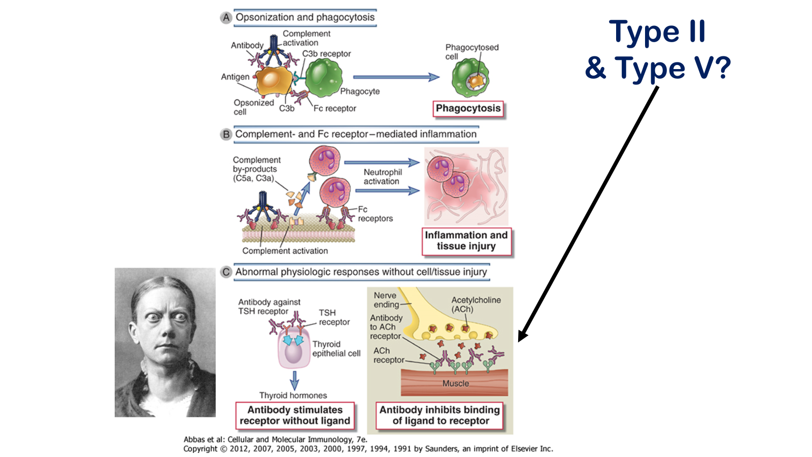 Effector mechanisms of antibody-mediated disease. A, Antibodies opsonize cells and may activate complement, generating complement products that also opsonize cells, leading to phagocytosis of the cells through phagocyte Fc receptors or C3b receptors. B, Antibodies recruit leukocytes by binding to Fc receptors or by activating complement and thereby releasing byproducts that are chemotactic for leukocytes. C, Antibodies specific for cell surface receptors for hormones or neurotransmitters may stimulate the activity of the receptors even in the absence of the hormone, as in Graves’ diseases (hyperthyroidism) (left panel), or may inhibit binding of the neurotransmitter to its receptor, as in myasthenia gravis (right panel). TSH, thyroid-stimulating hormone.