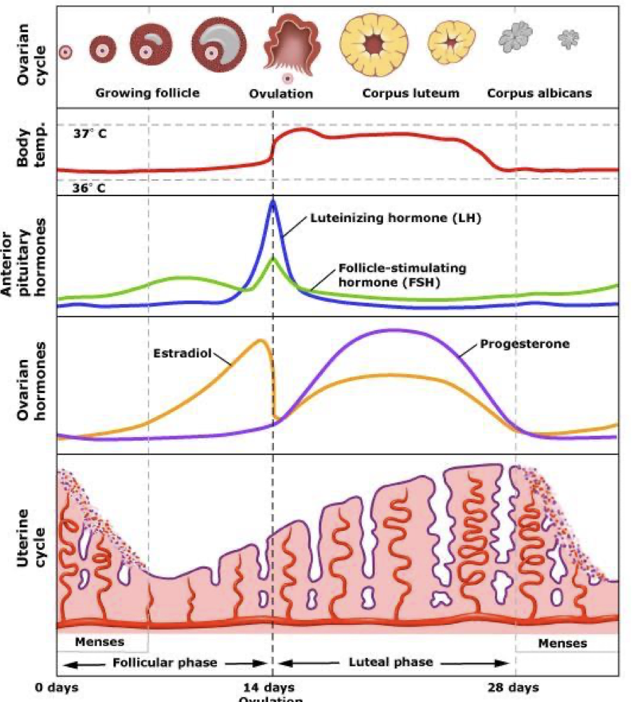 - Days 15-28: secretory phase (postovulatory)