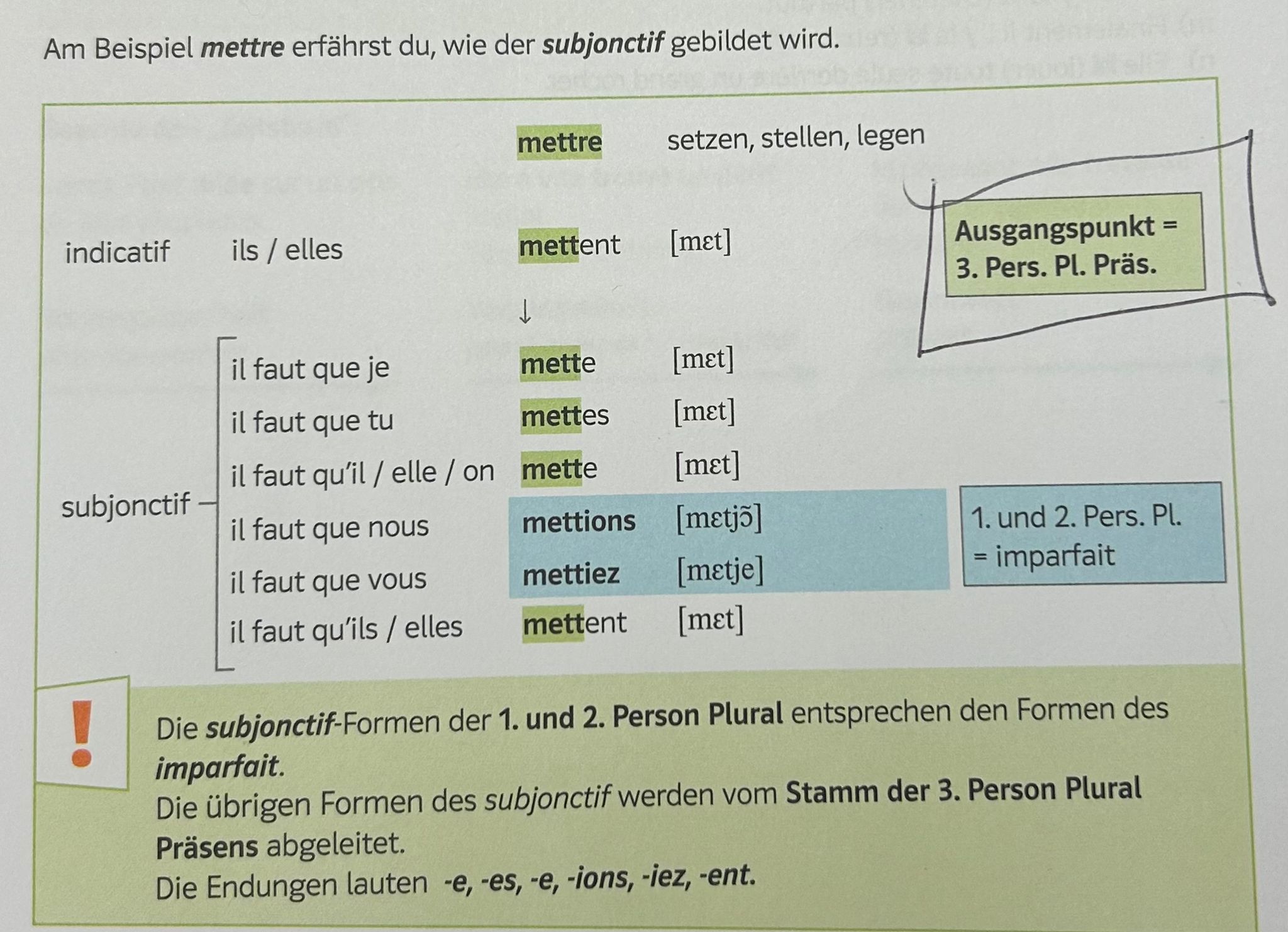 Die ĂŒbrigen Formen des subjonctif werden vom Stamm der 3. Person Plural PrĂ€sens abgeleitet.