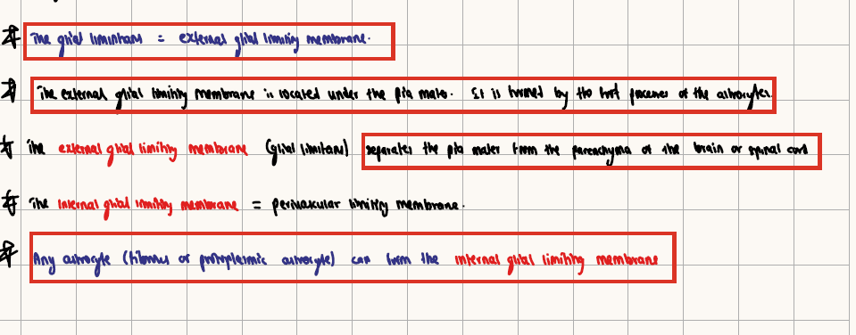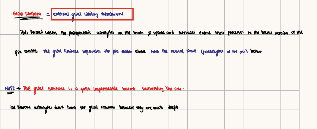 The glia limitans = EXTERNAL GLIA LIMITING MEMBRANE. It forms a barrier between the pia mater and the brain parenchyma.