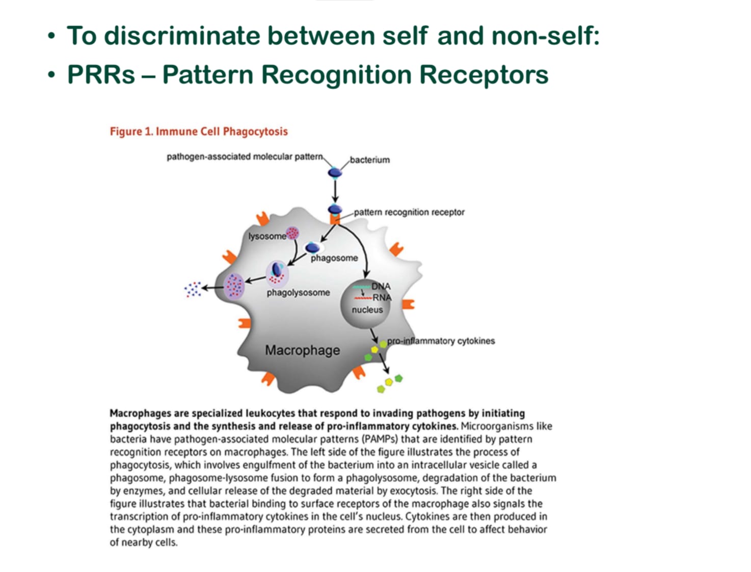 Innate immune cells (like macrophages, dendritic cells, neutrophils) use pattern recognition receptors (PRRs) to discriminate self vs non-self.