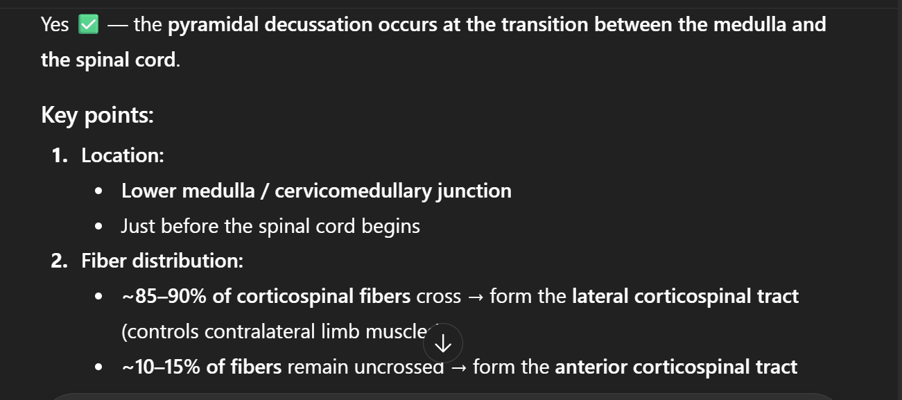 WHERE DOES THE DECUSSATION IN THE CORTICOSPINAL TRACT OCCUR:
