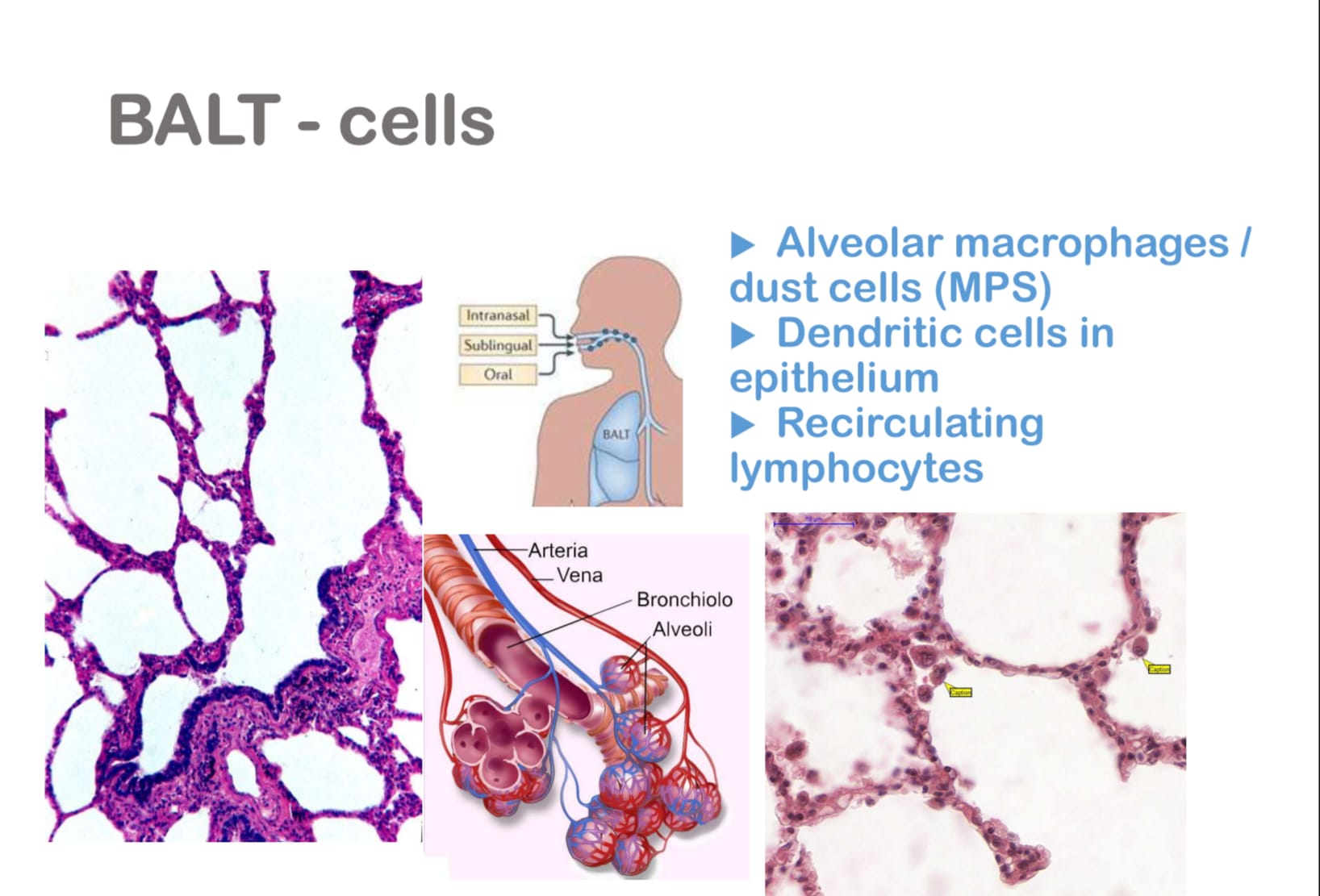 BALT consists of alveolar macrophages, dendritic cells, and recirculating B and T lymphocytes organized into lymphoid follicles, and functions in immune surveillance of the respiratory tract.