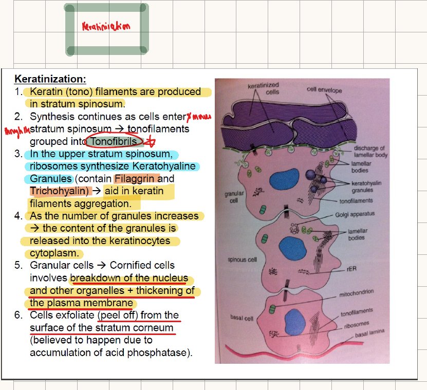 In the stratum granulosum, the keratinocytes contain keratohyaline granules which contains FILLAGRIN and TRICHOHYALINE.
