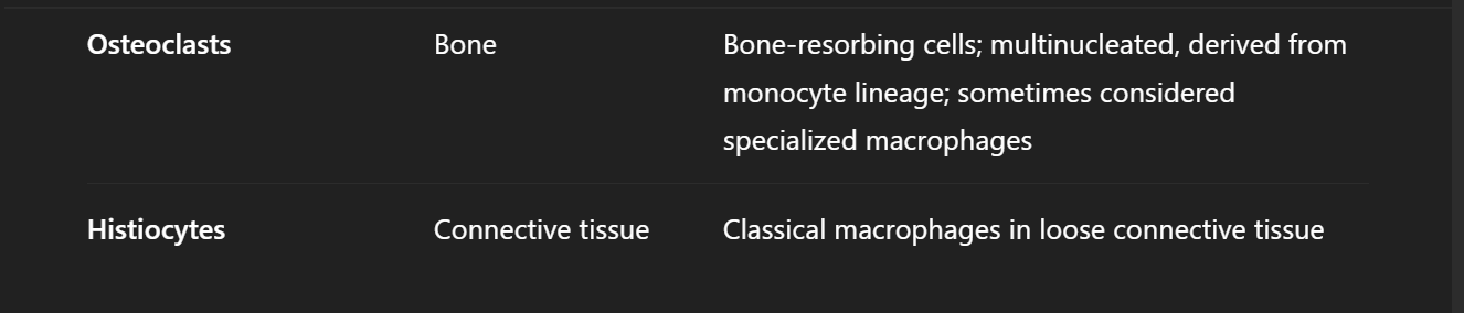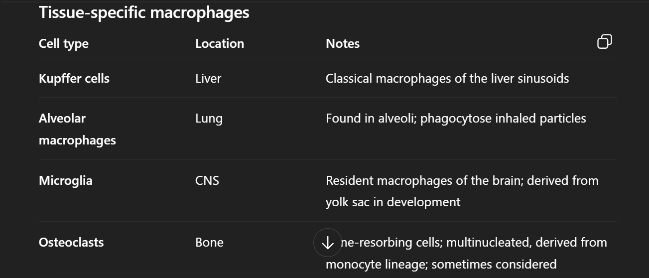 Alveolar macrophages | Lungs | Remove inhaled particles/pathogens |
