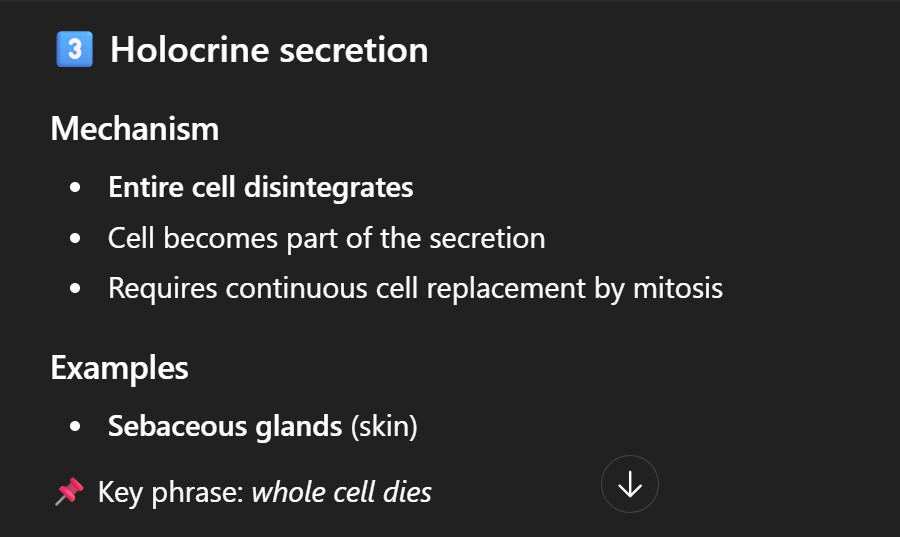 After holocrine secretion, the secretory cells dies and during the cells death they undergo nuclear changes such as: