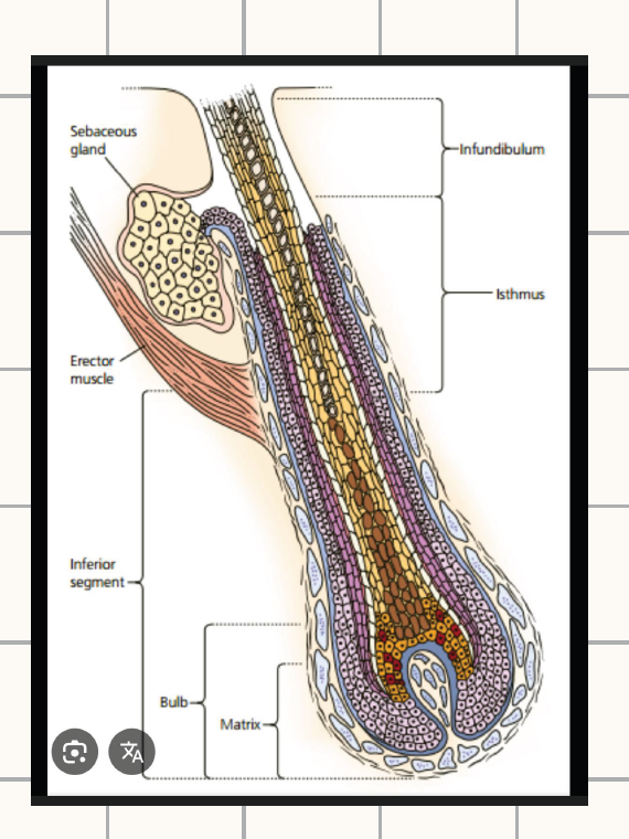 isthmus- extends from the level of the sebaceous gland to the attachment of the arrect pilli muscle.