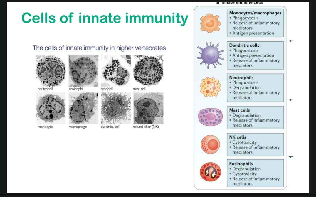 Innate immune cells are non-specific, rapid-acting cells like neutrophils, macrophages, dendritic cells, NK cells, eosinophils, and basophils that provide the first line of defense and activate adaptive immunity.