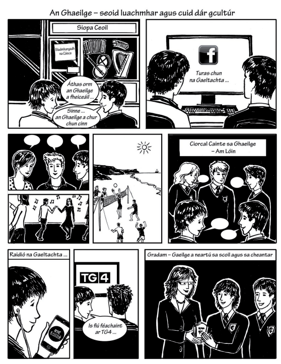 Bhí feabhas mór(big improvement) taghtha ar chaighdeán(standard)c-eye-g-dán Gaeilge na scoláirí. Bheartaigh siad ciorcal comhrá a eagrú ar scoil. Tháinig na scoláirí le chéile gach am lóin le comhrá as Gaeilge. Bhíodhbhí-uch an-craic acu. Mar a deir an seanfhocal ‘Beath teanga í a labhairt’.