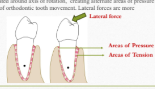 When lateral forces are applied, tooth is rotated around axis of rotation, creating alternate areas of pressure and tension. This forms the basic rationale of orthodontic tooth movement. Lateral forces are more damaging to the periodontal ligament.