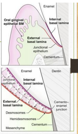 The junctional epithelium is attached to the tooth surface (epithelial attachment) by means of an internal basal lamina and to the gingival connective tissue by an external basal lamina