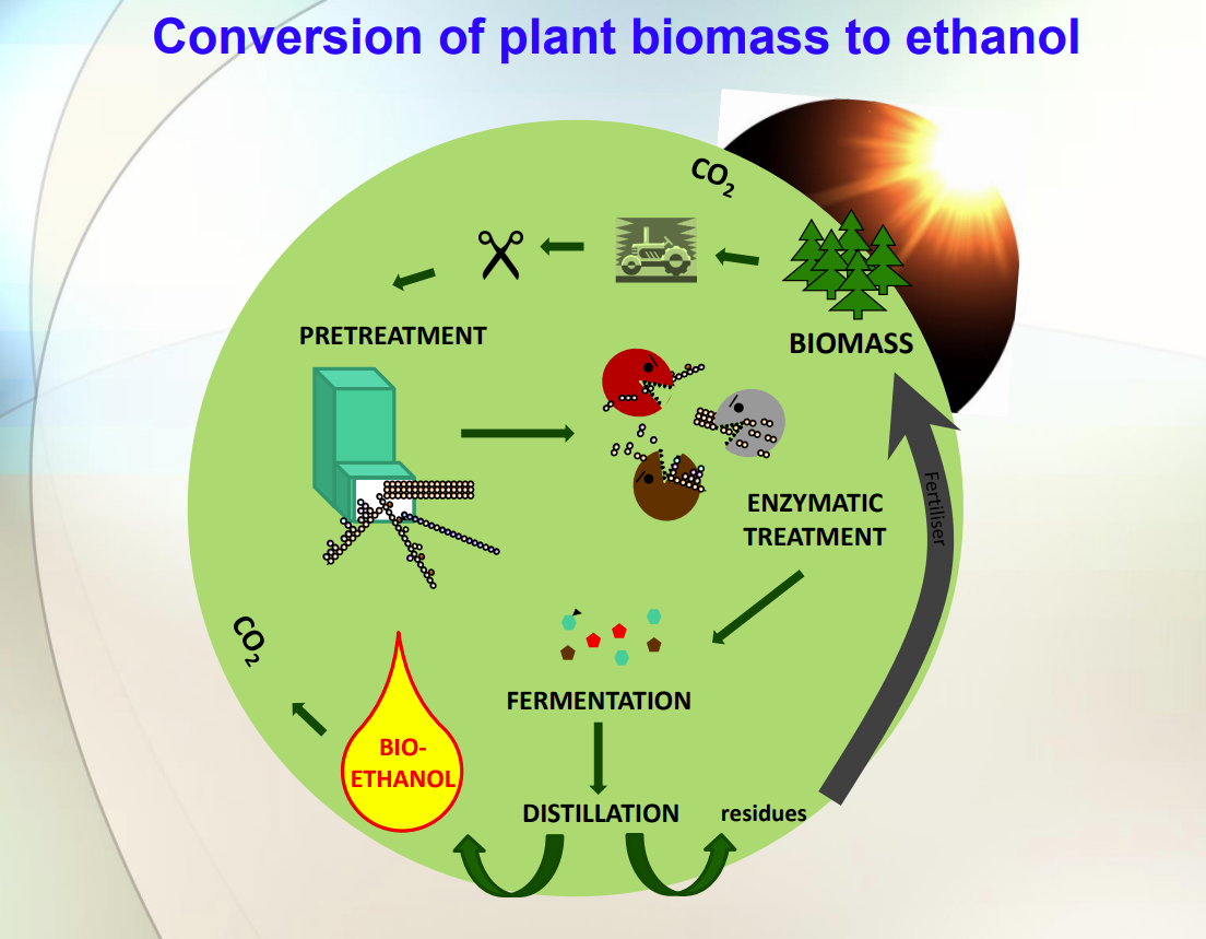 Plants predominantly consist of carbohydrates which if broken apart into sugars could be used for ethanol production