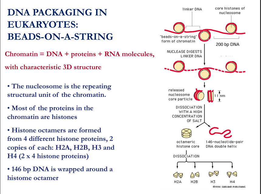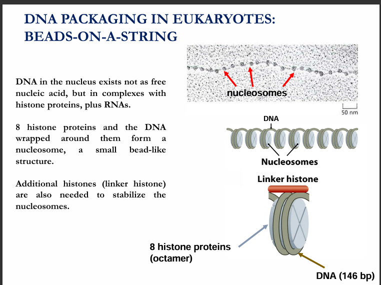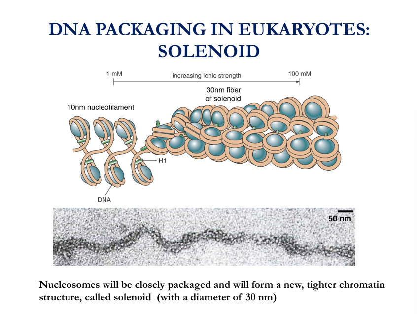 Histone H1 helps stabilise this structure by binding the “linker DNA” between nucleosomes.
