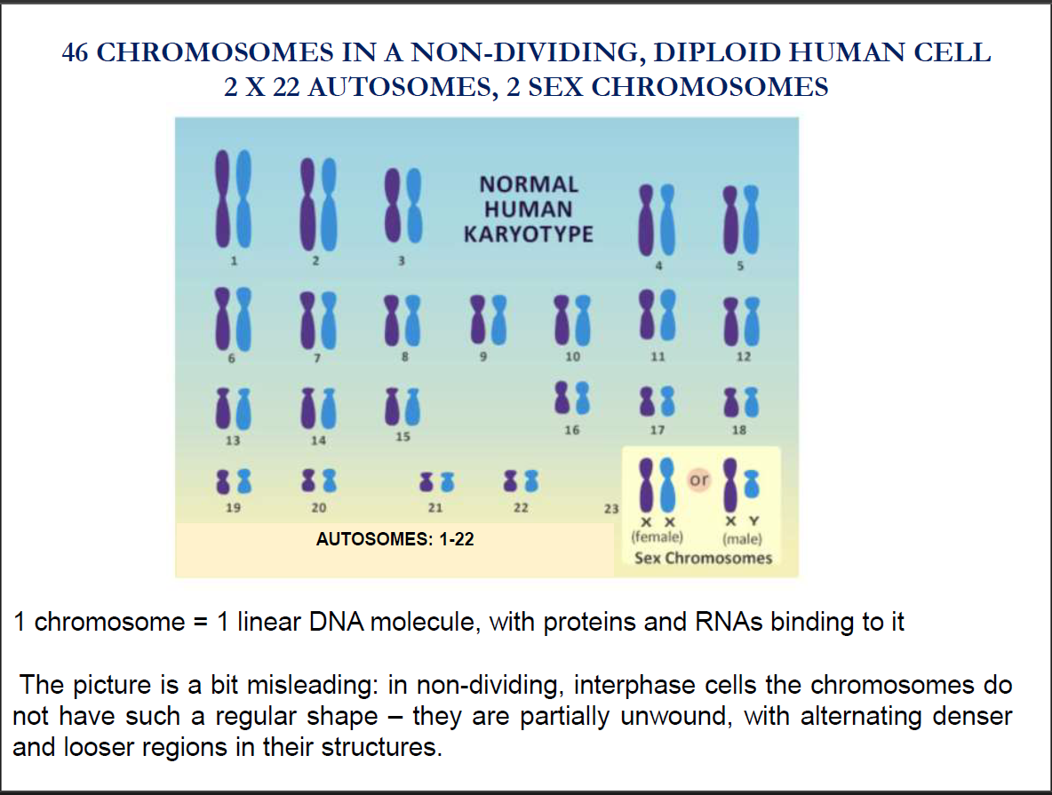 Key takeaway: In non-dividing cells (interphase cells), the chromosomes do not have a regular shape. They are partially unwounded, with alternating denser and looser regions in their structures.