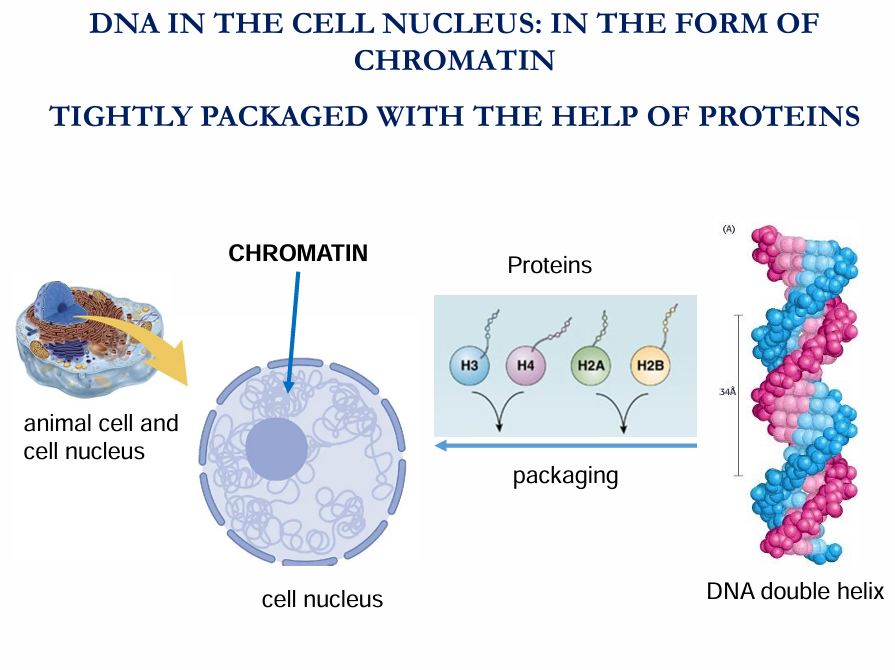 Chromatin is DNA wrapped around proteins called histones. This combination of DNA + proteins helps package the very long DNA molecules so they can fit inside the nucleus, while also controlling which genes are active.