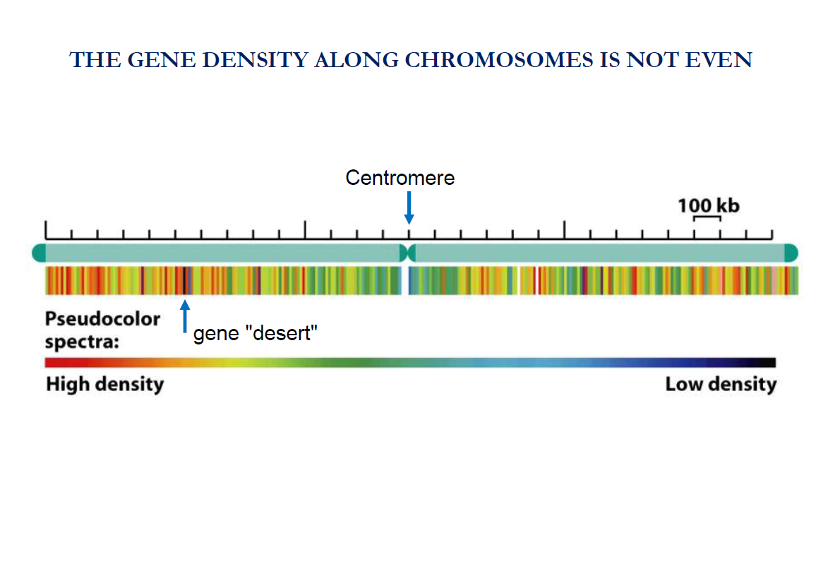 Some regions of the chromosomes are gene-rich (lots of genes are packed together).