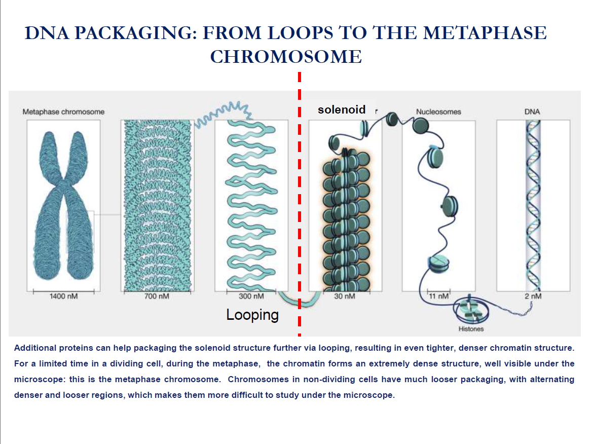 Chromosomes in non-dividing cells (cells in interphase) have much looser packaging, with alternating denser and looser regions, which makes them more difficult to study under the microscope, unlike the metaphase chromosomes, which are well visible on the microscope because the chromatin forms an extremely dense structure.