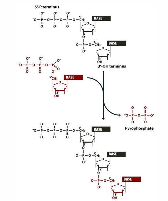 When a new nucleotide is added to the 3’ end, a pyrophosphate group leaves the reaction from the nucleotide triphosphate.