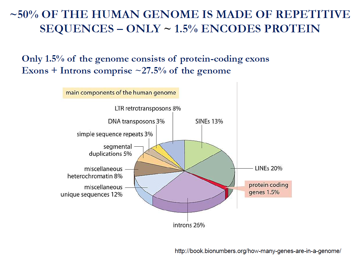 Only 1.5% encodes proteins, i.e. only 1.5% of the genome consists of protein-coding exons