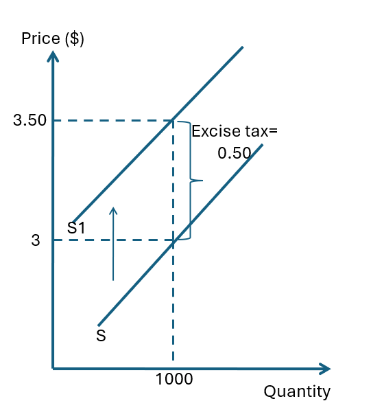 The vertical distance between old and new supply curves = size of the excise tax