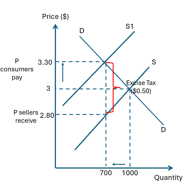 Price (Sellers)* | Higher | Lower (after paying tax to gov) | Sellers receive less net income per unit |