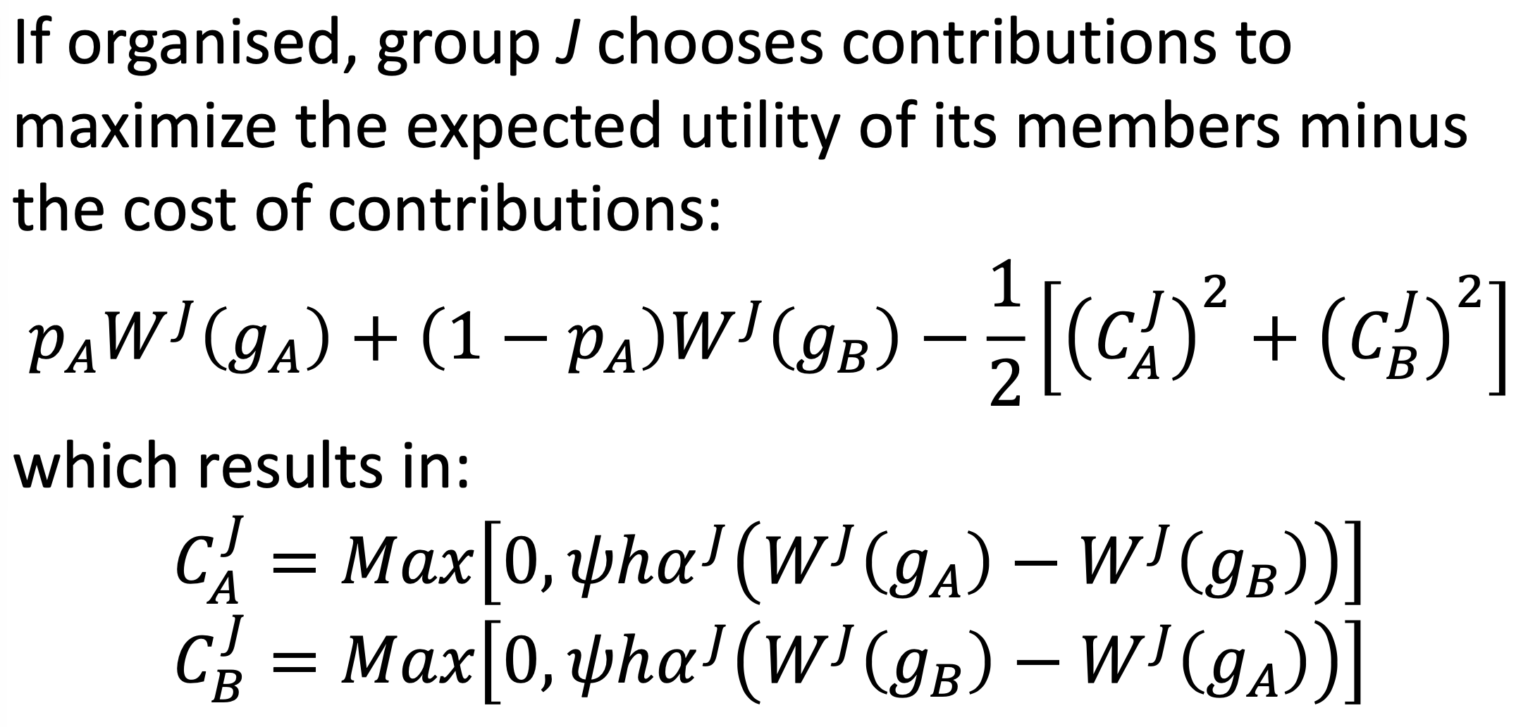 If organized, group J determines contributions aiming to maximize expected utility of its members minus cost of contributions