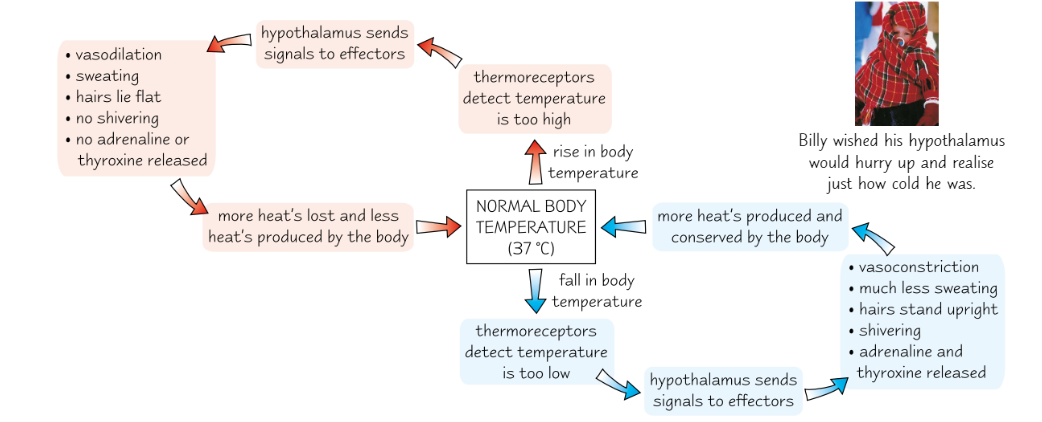 Thermoreceptors in the skin detect change in outside temperature sends signals (Using sensory neurone) to the hypothalamus (Detects changes in internal temp) sends signals to effectors using motor neurons which carry out a responds to restore body temperature. E.g to erector pili muscles or blood vessels close to the skin.