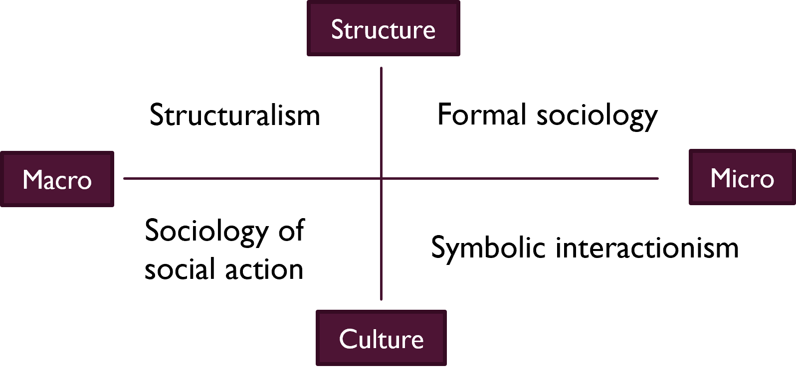 formal sociology (Simmel): micro-level structures, deterministic, people determined by positions