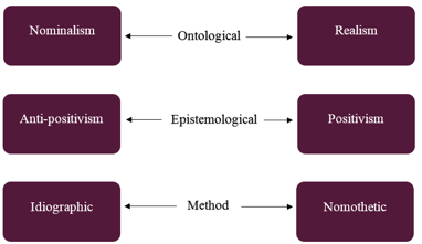 positivism/objectivism (you can know essence of reality) vs anti:positivism/subjectivism (can’t know essence of reality)