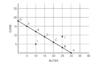 Points on the curve are attainable/producible. Considering point F, the country can produce 5 units of butter and 15 units of guns