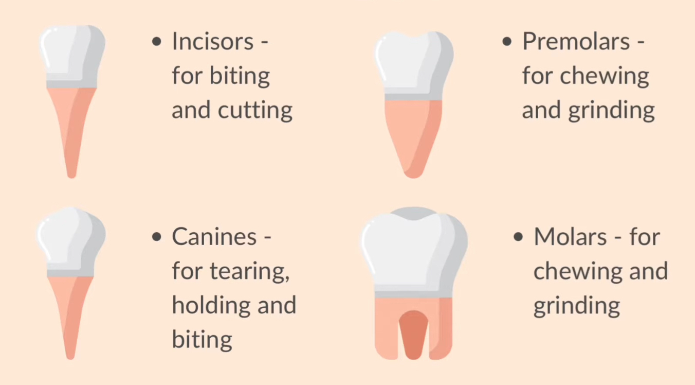 Humans have different types of teeth-incisors, canines, premolars, and molars-each serving specific functions: incisors for cutting, canines for tearing, and molars for grinding.