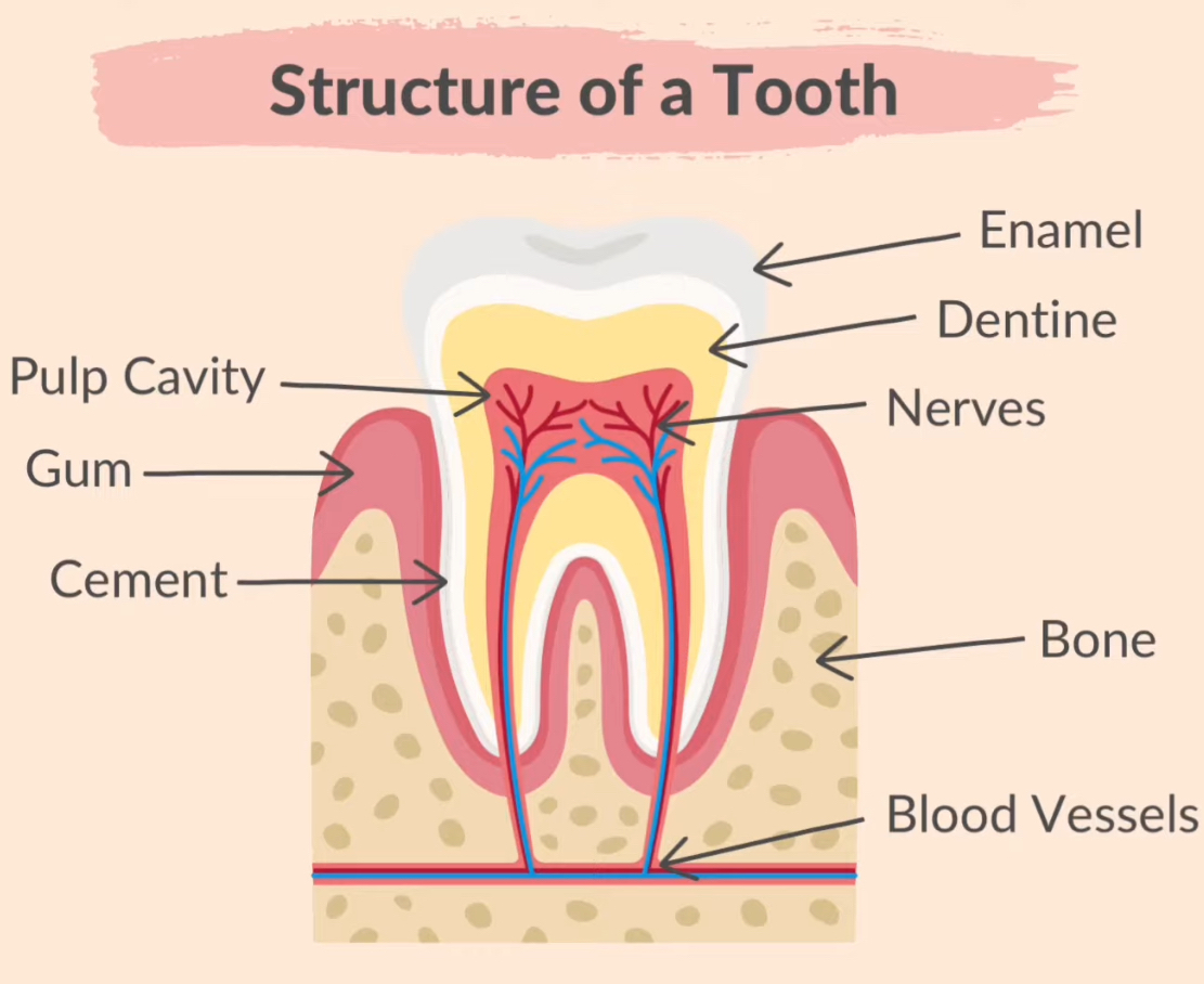 The structure of a tooth includes enamel, dentine, pulp cavity, nerves, blood vessels, and cement. Teeth are embedded in bone and gums.