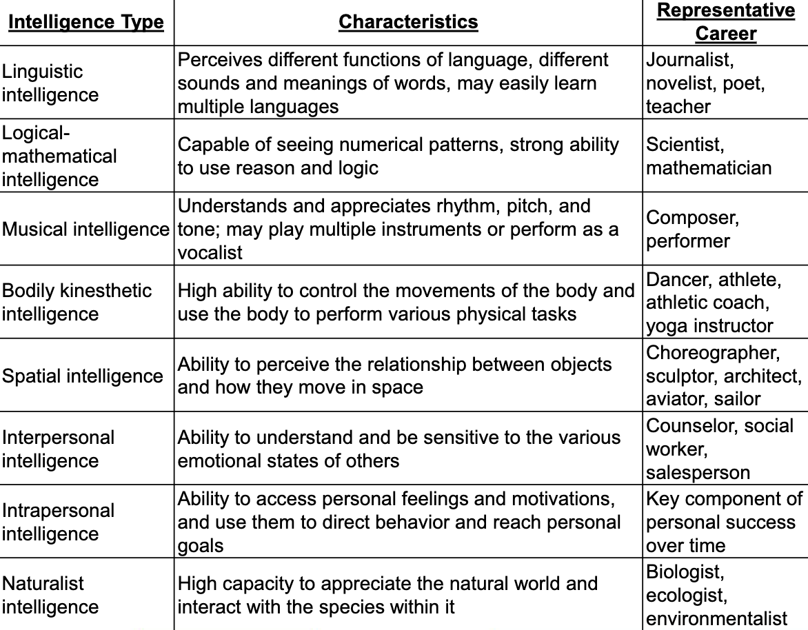 Musical intelligence | Understands and appreciates rhythm, pitch, and Musical intelligence tone; may play multiple instruments or perform as a vocalist | Composer, performer |