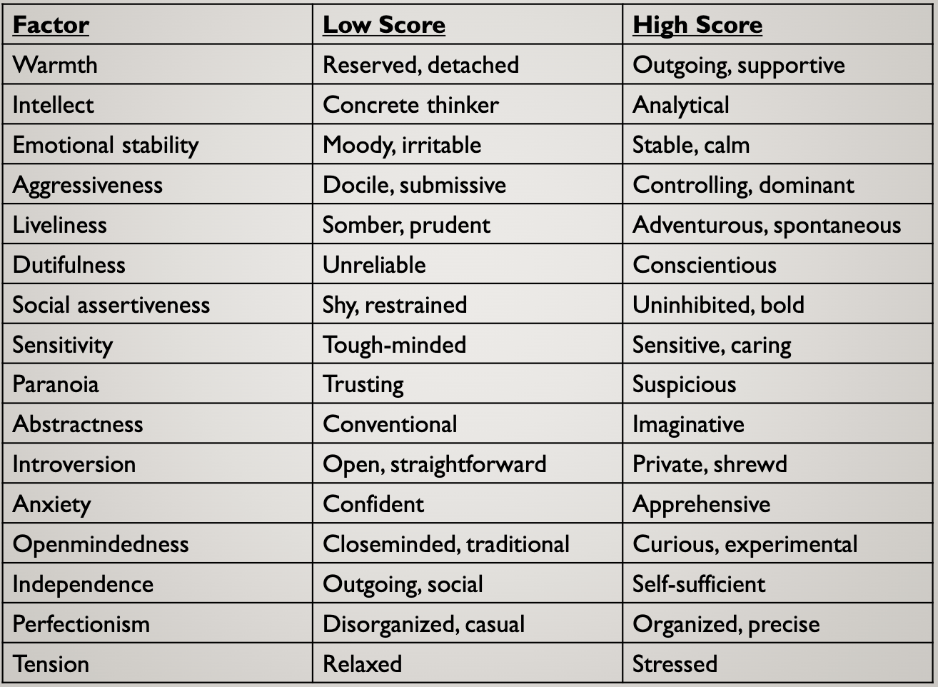 warmth, reasoning, emotional stability, dominance, liveliness, rule-consciousness, social boldness, sensitivity, vigilance, abstractedness, privateness, apprehension, openness to change, self-reliance, perfectionism, and tension