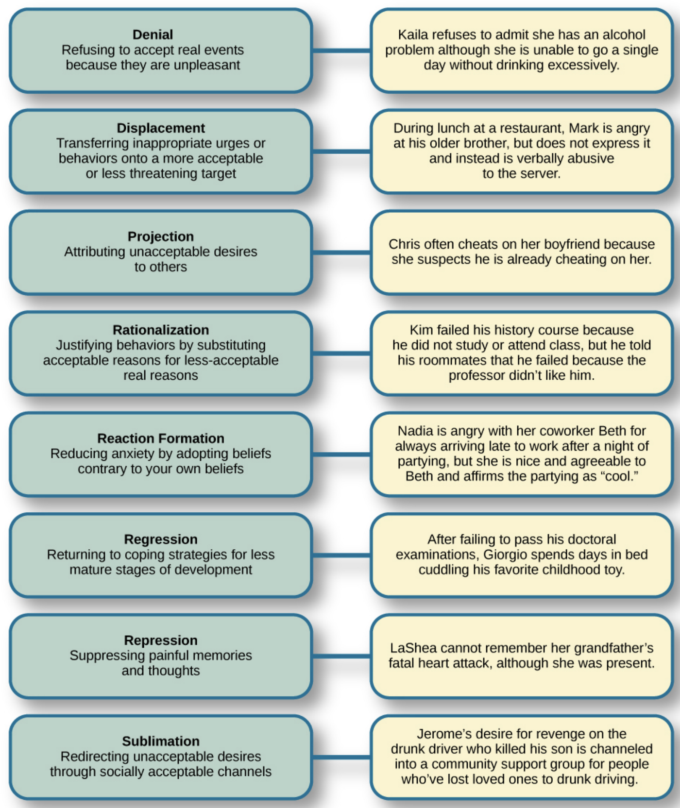 Displacement Transferring inappropriate urges or behaviors onto a more acceptable or less threatening target | During lunch at a restaurant, Mark is angry at his older brother, but does not express it and instead is verbally abusive to the server. |