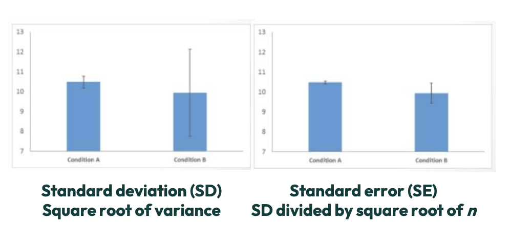 Variance is visually demonstrated in graphs by error bars